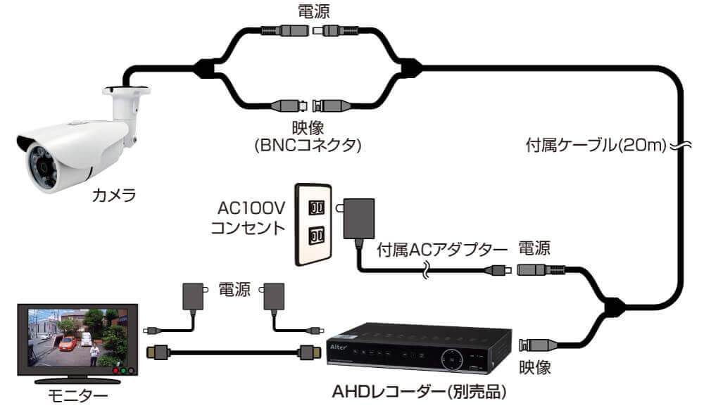 カメラはテレビやPCモニターに直接接続して映することはできません。設置の際はAHD対応レコーダー(HR-104)をお求めの上、ご設置ください。