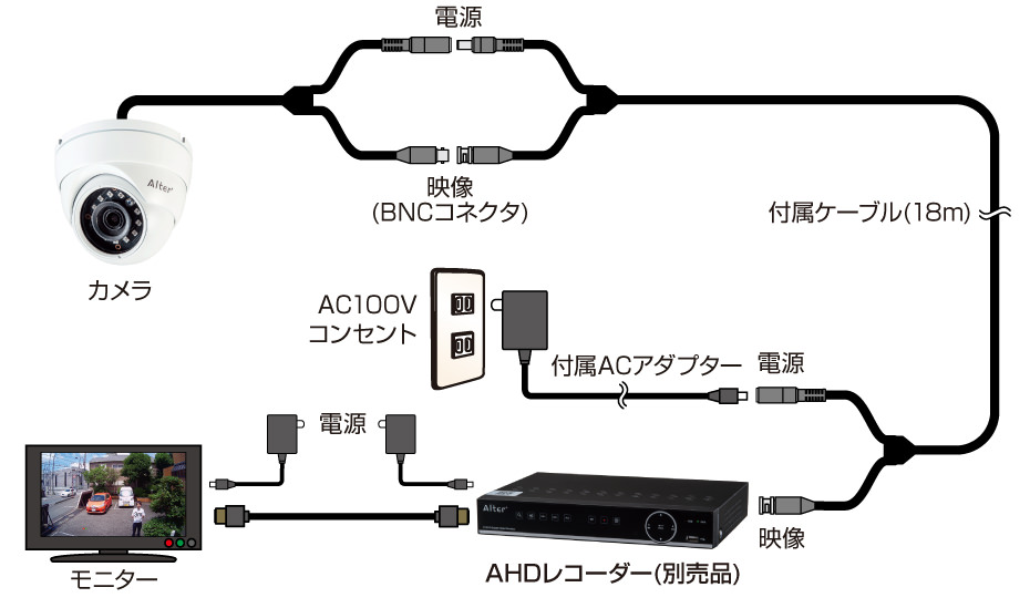 AHDカメラ利用時はAHDカメラに対応する録画機が必要です。