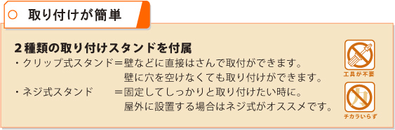 | ・取り付け用ネジセット | ×1 | ・クリップ式スタンド | ×1 |