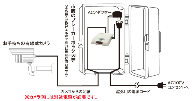 設置位置の都合上、送信機が屋外になってしまう場合は、右図のように市販のブレーカーボックス等を設置し、屋外用の電源コード等を利用して送信機の近くまでAC100Vコンセントを用意し、水の浸入が無いように保護してください。