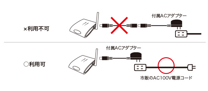 ご注意:カメラとACアダプター間の電源ケーブル延長はできません