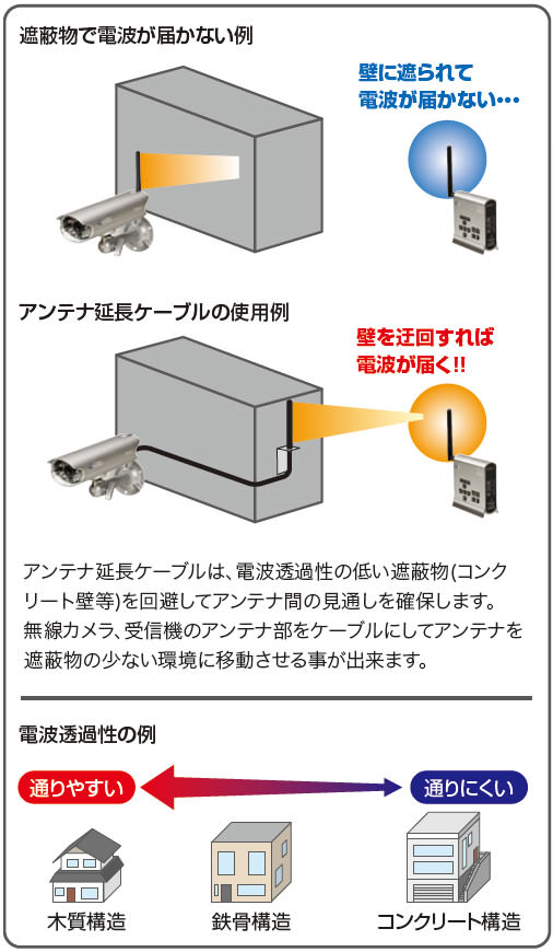 コンクリートやヘーベル材等の壁面をまたぐ場合、電波が飛ばない恐れがあります。