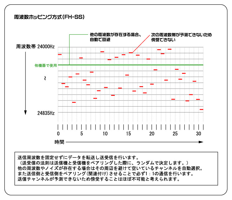 送信周波数を常時可変(ホッピング)させることで周波数を特定されず第三者に傍受される心配がありません。 カメラと受信機は必ず1:1の状態で通信を行います(ペアリング)。 ※同機器を2セット以上使用した場合、混信する事はありませんが電波状況が悪くなります。 他の周波数やノイズが存在する場合はその周辺を避けて空いているチャンネルを自動選択するため他機器との混信がありません。 |