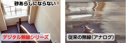 カメラの映像は約30万画素のVGA(640x480pixel)サイズ。 デジタル伝送を行うことでノイズが発生せずにクリアな映像を映し出します。 従来のアナログ無線で多かった砂あらしノイズによる映像の乱れが発生しません。 ![]() 画面コマ数を自動調整して画質をキープ 使用中に電波状況が悪くなった場合でも、1秒間あたりの画面コマ数(フレームレート)を自動調整して映像を表示。 電波状況が悪い場合でも映像のコマ数を落としてクリアな映像をキープします。 |