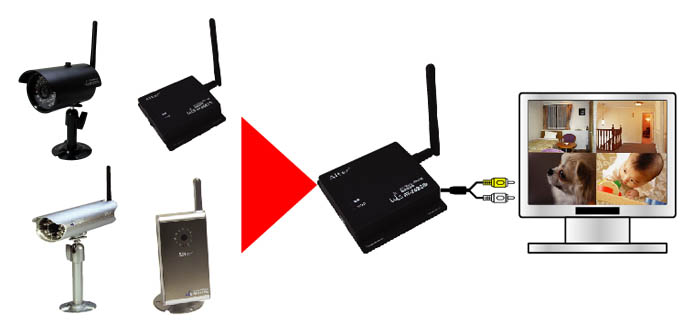 1台の受信機で最大4台までカメラを増設可能! 増設時は4分状態での表示やカメラの映像を順に切替えて(巡回監視)確認が可能です。 |