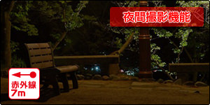 ![]() 暗くなると内蔵の照度センサーが自動的に働き夜間撮影モードを開始。 夜間撮影時は最大で7m先までを撮影することができます。 ※夜間撮影時は白黒映像となります。 |