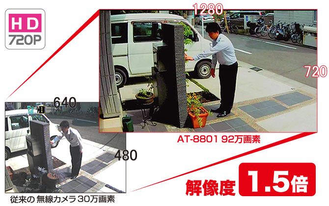 当社無線カメラ史上最高の92万画素(720p)のカメラモジュールを搭載。ハイビジョン映像のまま無線送信を実現しました。