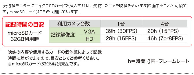 | 録画解像度 | 1280X720(HD)/680X480(VGA)(各カメラ個別設定) |