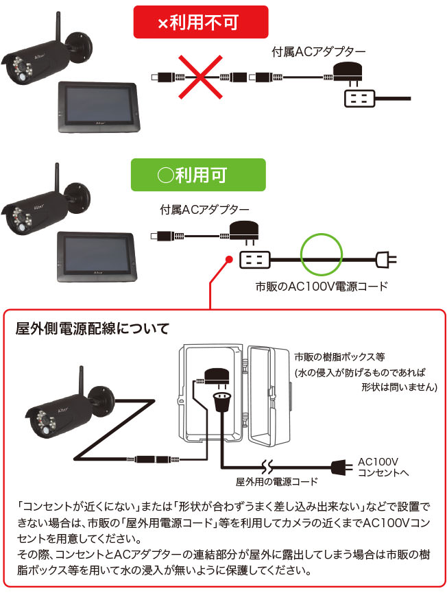 電圧降下が発生する為、本機はDC側の電源延長ができない仕様となっております。 電源の延長の際は、AC100V側のコンセント電源を延長タップ等でご用意ください。