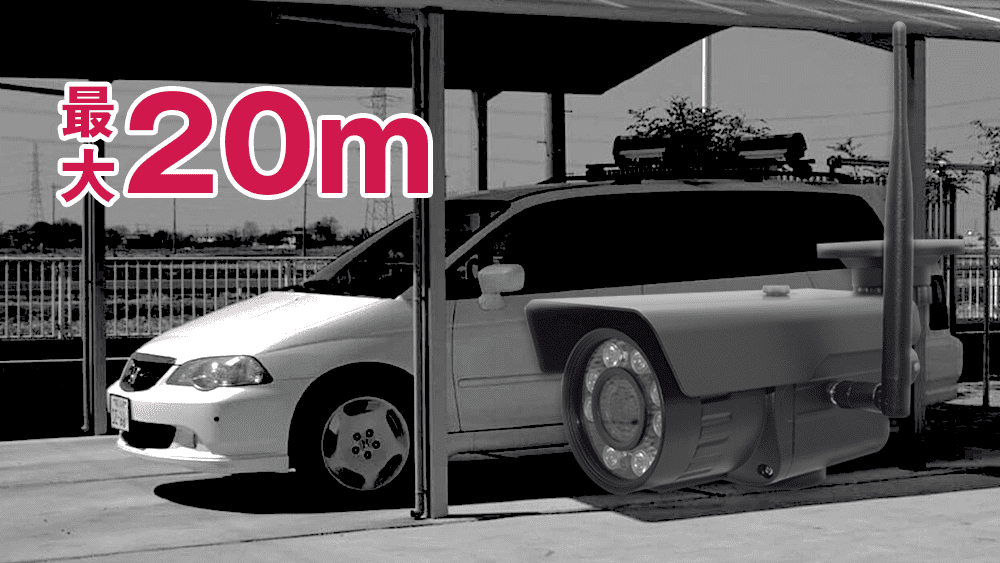周囲が暗くなると自動で夜間撮影モードに切り替わり最大で約20mの赤外線撮影が可能です。※広角撮影時は10m以上先の映像は判別しにくくなります。